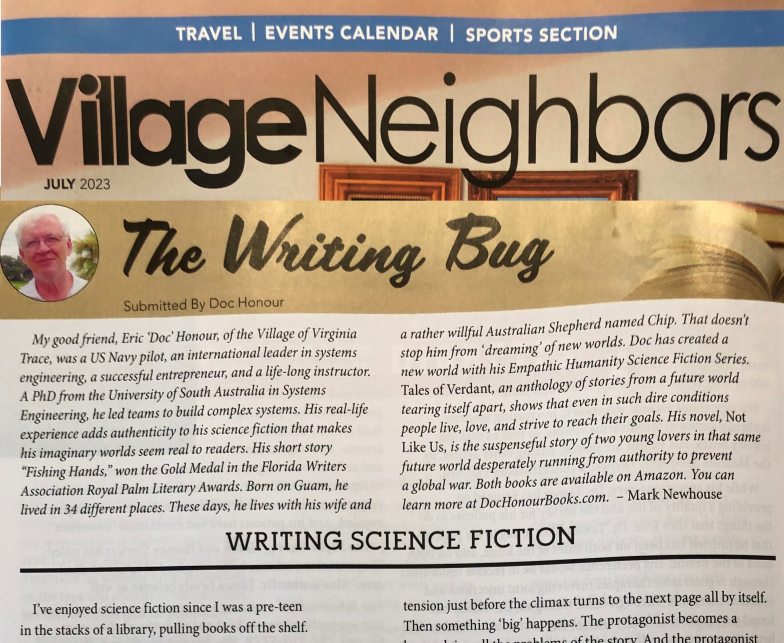 Several months ago, my good friend Mark Newhouse asked if I would do a guest column for his article “The Writing Bug” in the local monthly magazine Village Neighbors. Mark is an accomplished author with multiple international awards, several for his acclaimed series The Devil’s Bookkeepers, based on true records from the Lodz Jewish ghetto in Nazi-controlled Poland. He also authors children’s books and has a series being converted to podcasts for this autumn.
