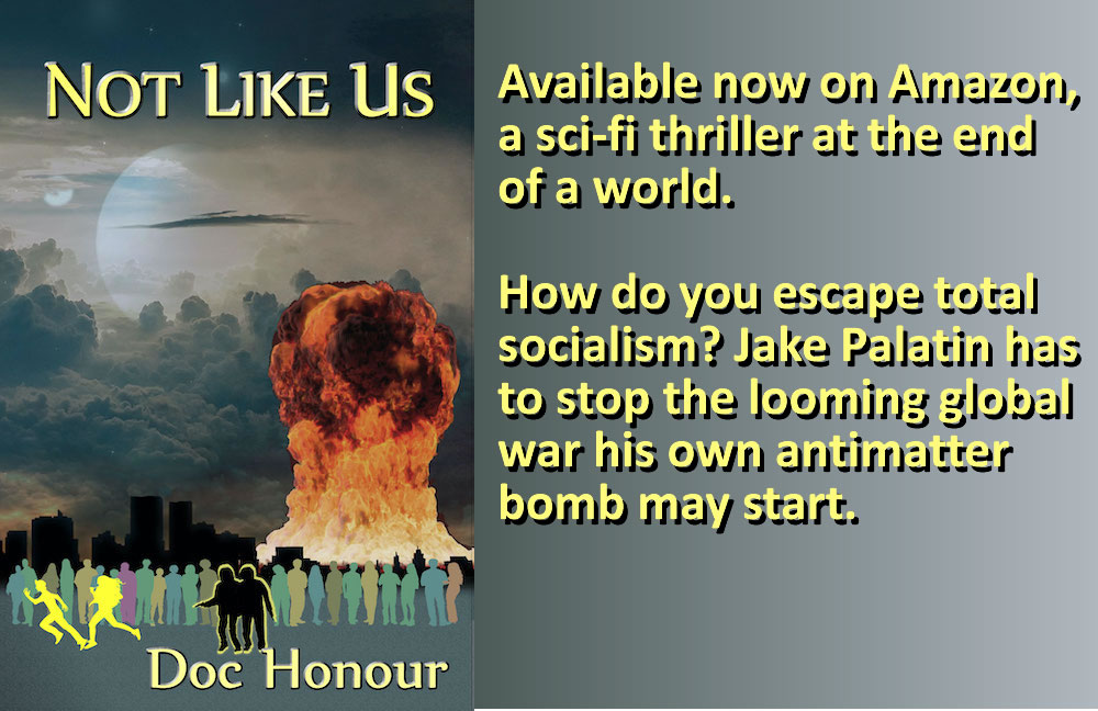 I am pleased to announce the release of my premier novel Not Like Us, available now on Amazon in hard cover, paperback, or Kindle versions. How do you escape total socialism? Jake Palatin is forced to develop an antimatter bomb on the planet Verdant, where global war using his technology is terrifyingly close. Zofia, a womanContinue reading “RELEASED: “Not Like Us””